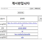 PHP 게시판만들기4(게시글작성) 게시글작성을 누르면 create.php로 넘어간다. 제목,내용을 써서 게시물을 달수있다. 글쓴이는 자기 ID로 수정할수없다. 게시물달기를 누르면 createup.php로 넘어간다. 제목,내용,아이디가 데이터베이스에 들어가게된다.성공적으로 데이터베이스에 추가됬다면 게시판리스트로 다시 넘어간다. 게시판리스트에는 새로작성한 글이 올라간다. 수정 게시판리스트에 오른쪽에보면 수정버튼이있다. 수정버튼을 클릭시 게시판의 번호와 아이디값이update.php로 넘어간다. 글쓴이는 건드릴수없고 제목과내용을 수정한다. 수정하기를 누르면 updateup.php 페이지에 수정중.....이 떴다가 다시 look.php게시판리스트로 돌아가면 수정되어서 올라가있을것이다. 삭제 게시판리스트 수정옆에 ..